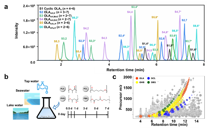 水中可降解塑料释放的低聚物:研究团队在不同类型的水体(自来水、海水、湖水)中系统研究了四种常见可降解塑料(PLA、PHB、PCL和PBS)的低聚物释放及其环境归趋。结果显示,这些微塑料在7天内可释放近200种不同类型的低聚物,且其降解行为存在明显差异。释放的低聚物主要以同系物为主,而端基修饰的低聚物(如甲氧基化、羧酸化)虽然释放速率较低,但在水体中的稳定性更强。此外,研究首次发现生物内源性小分子半胱氨酸可在水中与可降解塑料低聚物发生自发结合,这一发现为低聚物的生物相互作用研究提供了新的视角。