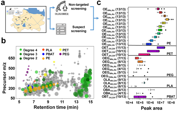 高分子低聚物在实际污水中的存在:Oligomer-Finder平台结合怀疑筛查方法,成功应用于大规模真实污水分析。在来自13座污水处理厂的污水样品中,共鉴定出26种低聚物的5种可能高分子聚合物来源,包括传统塑料(PE和PET)、可溶性聚合物(PEG),以及当前广受关注的可降解塑料(PLA和PBAT)。此外,还检测到数百种不同置信级别的疑似低聚物。生态毒性实验评估结果表明,低聚物可能对水生生态系统具有潜在毒性。合成的聚乳酸低聚物及四种可降解塑料的降解产物对斑马鱼胚胎表现出发育毒性。