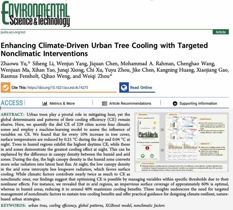 近日,日韩无码 余兆武团队联合国内外多所高校及科研机构,在全球城市热岛效应缓解策略研究领域取得重要进展。相关成果以Enhancing Climate-Driven Urban Tree Cooling with Targeted Nonclimatic Interventions为题,发表于环境领域国际顶级期刊Environmental Science & Technology。该研究通过全球多尺度数据分析与机器学习模型,揭示了不同气候区城市树木降温效率的时空分异规律,并提出优化非气候因素以提升降温效益的创新路径,为全球城市绿地规划提供了科学依据。