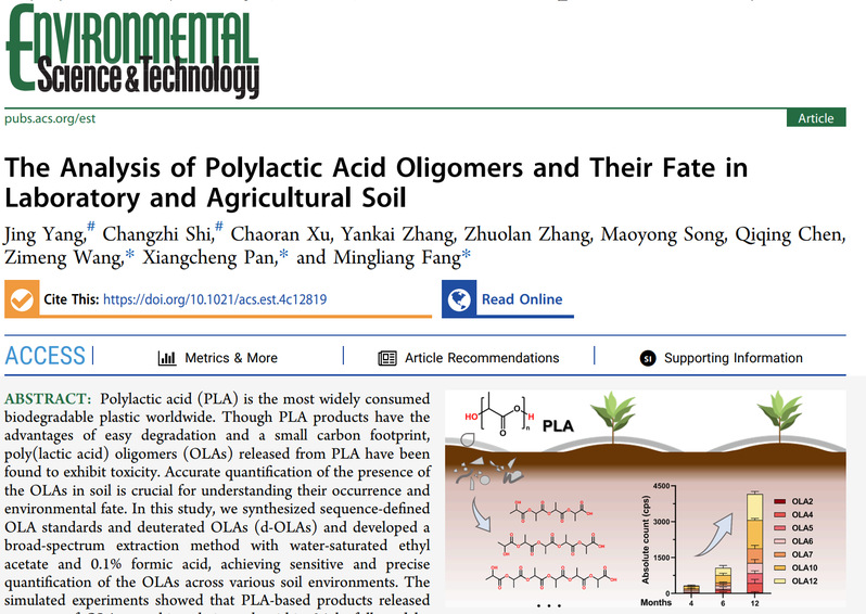 近日,该研究团队进一步攻克了土壤这一更为复杂的基质,建立了聚乳酸低聚物的精准检测方法,并初步揭示了其在土壤环境中的迁移转化规律,为后续研究低聚物的长期环境行为及生态风险奠定了重要基础。论文以“The analysis of polylactic acid oligomers and their fate in laboratory and agricultural soil”为题,发表于美国化学会杂志Environmental Science & Technology,方明亮、潘翔城、王梓萌为共同通讯作者。工作得到了国家重点研发计划、中科院先导项目、国家自然科学基金委优青项目、以及小米青年学者、仲英青年学者、安捷伦等方面的资助。论文第一作者杨婧、时长志现分别为日韩无码 环境系硕士生、博士生,寡聚体的同位素标记得到南京大学江伟团队的支持。