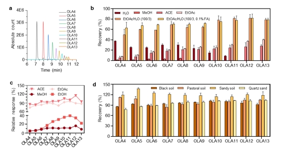 2.优化提取方法,提高检测精度:团队基于回收率优化了土壤中OLAs的提取溶剂,最终确定水饱和乙酸乙酯和0.1%甲酸的混合溶剂为最佳提取剂。该方法可对具有不同极性特征的一系列OLAs实现有效提取,显著提高提取效率,在不同土壤中的回收率经内标校正后可达77.74 - 137.39%,确保了后续检测结果的准确性。