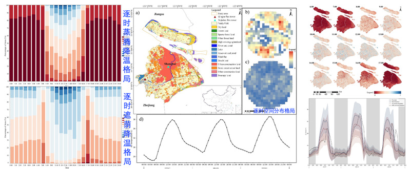 团队利用该模型研究了2022年上海市极端高温期间植被蒸散-遮荫降温变化。结果表明:(1)极端高温期间,城市植被夜间(18:00-6:00)降温能力增强。这是由于遮荫的累积效应和由于饱和水汽压差导致的蒸发量增加所致。(2)在植被缺乏且建筑密集区,热调节能力明显缺乏,特别是在清晨(7:00)和傍晚(17:00)。(3)植被在中午(11:00-13:00)蒸发冷却略有减少,这是因为极端高温下植被气孔关闭造成的。同时,高辐射导致植被的遮荫效应更加突出,放大了植被茂密和稀疏区域之间的降温格局。此外,研究还发现,覆盖率超过50%的草地可以提供与林地类似的降温效果。总体而言,本研究不仅增强了对城市植被降温效应的理解,而且强调了战略性城市植被规划在缓解城市热环境方面的重要性,特别是在热浪频率和强度不断增强的情况下。