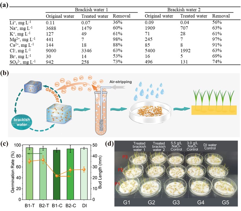 图5. 脱盐后微咸水在水稻栽培中的表现。(a)原始微咸水与脱盐后微咸水中的离子浓度。(b)用于水稻栽培的水凝胶脱脱水-盐系统示意图。(c)用脱盐微咸水及相应对照水灌溉的水稻种子发芽率和芽高。(d)第7天用脱盐微咸水及相应对照水灌溉的水稻种子照片。