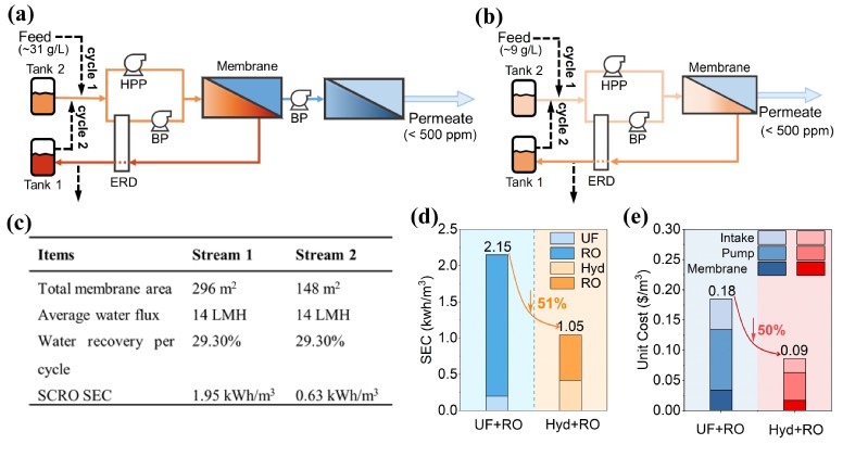 图6. SCRO工艺中每个循环对进水1(a)和进水2(b)的详细操作示意图。(c)SCRO工艺中两条水流的操作结果表。(d)UF-RO系统与水凝胶-RO系统的总比能耗(SEC)对比。(e)UF-RO系统与水凝胶-RO系统的总资本成本对比。Hyd(水凝胶)、HPP(高压泵)、BP(增压泵)、T(水箱)、ERD(能量回收装置)。