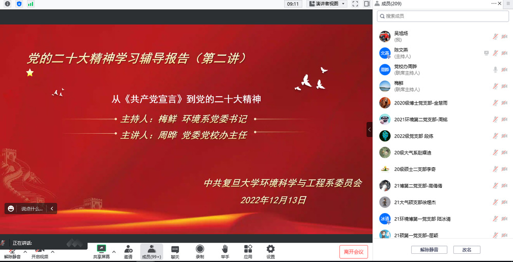 为深入学习宣传贯彻党的二十大精神,把党员干部师生群众思想和行动统一到党的二十大精神上来,落实学校《关于认真学习宣传贯彻党的二十大精神的通知》以及系党委工作安排,2022年12月13日,日韩无码 党委组织举办党的二十大精神学习辅导报告第二讲,邀请“日韩无码 党的二十大精神宣讲团”成员、校党委党校办主任兼《共产党宣言》展示馆党员服务队指导教师、高校伟大建党精神研究中心复旦分中心周晔研究员做专题党课讲解,该党课同时为电影《望道》配套党课。系党委书记梅鲜同志主持,日韩无码 和大气与海洋科学系全体教职工、退休党员、学生党员参加学习。