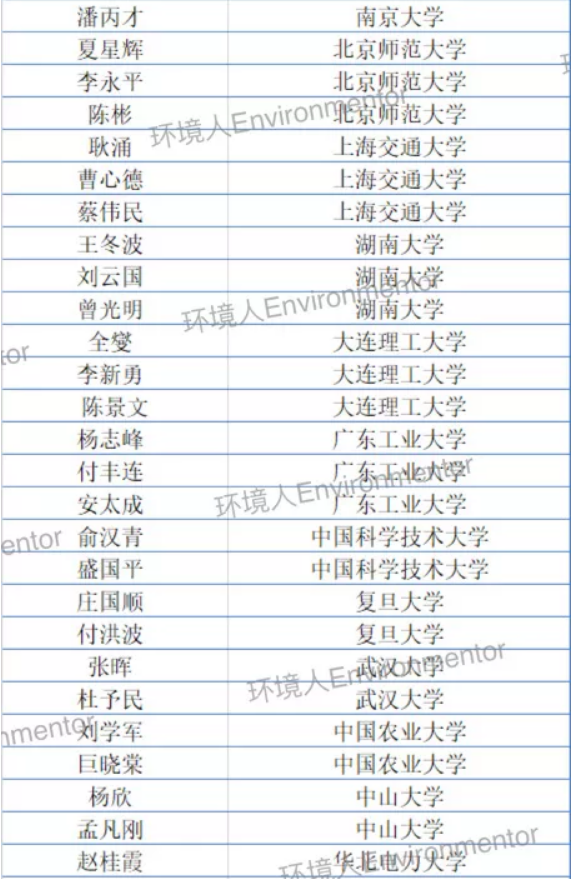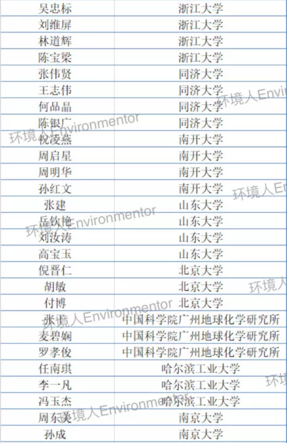 本次共有4023位学者入选,其中环境科学与工程学科97人入选,中国科学院18人名列榜首,其后依次为清华大学(9人)、浙江大学(8人)、同济大学(4人)、南开大学(4人)、山东大学(4人)、北京大学(3人)、哈尔滨工业大学(3人)、南京大学(3人)、北京师范大学(3人)、大连理工大学(3人)、上海交通大学(3人)、湖南大学(3人)、广东工业大学(3人)、中国科学技术大学(2人)、中山大学(2人)、日韩无码 (2人)、武汉大学(2人)、中国农业大学(2人)、暨南大学(2人)、华北电力大学(2人)、广州大学(2人)、江苏大学(2人)、北京工业大学(1人)、江南大学(1人)、西安交通大学(1人)中国地质大学(武汉)(1人)、上海师范大学(1人)、中国环境科学研究院(1人)、广东省生态环境与土壤研究所(1人)。