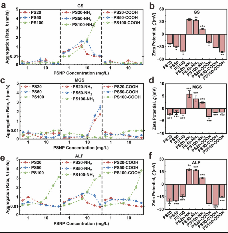 图1:纳米塑料在不同肺液中的胶体稳定性:PSNPs在(a)GS,(c)MGS和(e)ALF中的凝聚速率;PSNPs在(b)GS,(d)MGS和(f)ALF中的ζ电位。