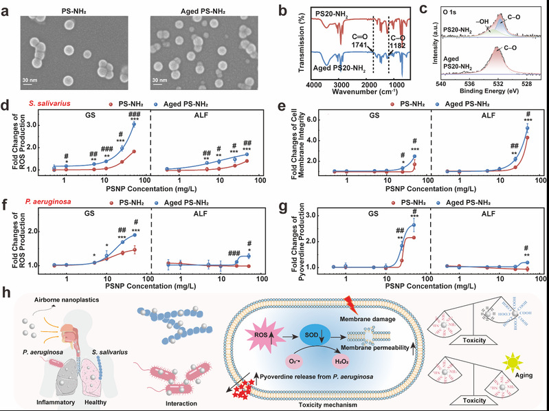 图6:老化PSNPs对肺部原生细菌和机会性致病菌的影响:(a)原始和老化PS-NH2的(a)SEM图像、(b)FTIR光谱和(c)XPS O 1s能谱;原始和老化PS-NH2在GS和ALF中对唾液链球菌(d)ROS生成和(e)细胞膜完整性的影响;原始和老化PS-NH2在GS和ALF中对铜绿假单胞菌(f)ROS生成和(g)绿脓菌素生成的影响;(h)PSNPs对肺部细菌的毒性机制图。