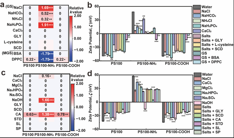 图2:肺液组分对纳米塑料胶体稳定性的影响:(a)GS/MGS,(c)ALF组分存在下PSNPs的相对凝聚速率;(b)GS/MGS,(d)ALF组分对PSNPs ζ电位的影响。