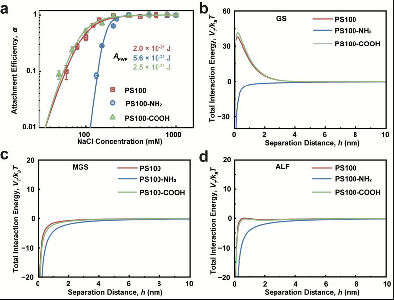 图3:基于DLVO理论的PSNPs凝聚行为预测:(a)PSNPs在NaCl溶液中的实验附着效率DLVO拟合;DLVO理论计算PSNPs在(b)GS, (c)MGS和(d)ALF中的总相互作用能。