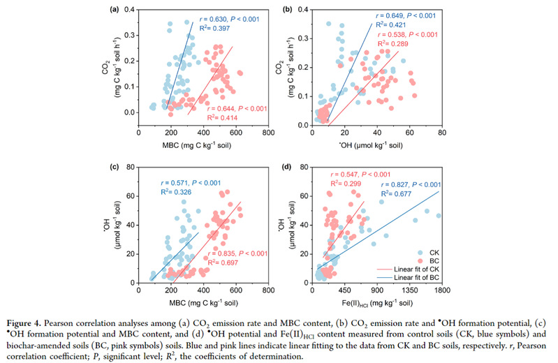 团队以生物炭改良的旱地农田表层土壤为对象,分析了多种活性物种(铁和羟基自由基)、有机碳库与微生物群落及功能的关系,发现微生物的碳利用效率和胞外电子传递能力的显著提高,驱动了土壤好氧-厌氧过渡区域内异化铁还原及类芬顿反应。