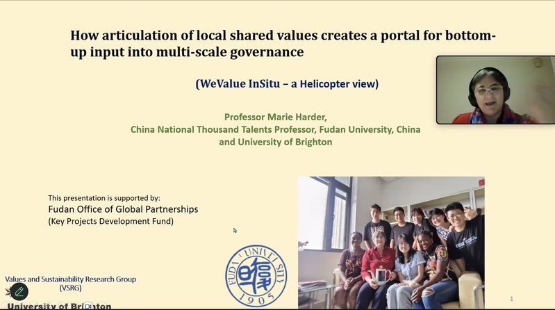 Marie Harder教授作报告:《How articulation of local shared values creates a portal for bottom-up input into multi-scale governance》,旨在强调外部政策制定者和本土社区的思维方式存在根本性的不同,该报告提出了一个新颖的方法论来弥补两者之间的巨大鸿沟。通过WeValue InSitu approach来阐明和提炼自然人群共享价值观(shared values),协助本土社区形成能够清晰真实地反映其共享价值观的陈述,并系统性构建这些陈述之间的联系与结构,进一步“凝结”出本地化的原型指标或决策支持工具,使得在地的本土共享价值观可以为外部人员所认知和理解,以进一步推动可持续发展的变革过程。
