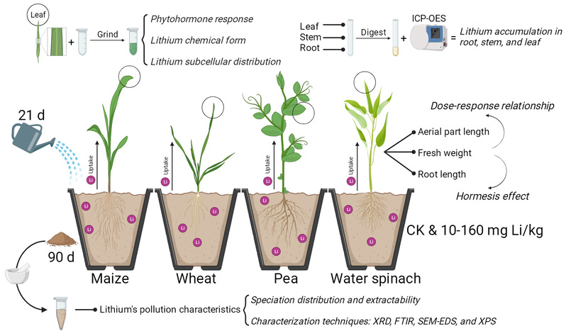 2024年8月20日,日韩无码 王祥荣教授城市生态学研究团队在国际著名学术刊物Environmental Science & Technology上在线发表了题为“Integrated Analysis of Pollution Characteristic and Ecotoxicological Effect Reveals the Fate of Lithium in Soil-Plant Systems: A Challenge to Global Sustainability”的研究论文。锂具有优异的电化学性能,在锂电池生产中起着举足轻重的作用。然而,在人为因素的作用下,锂成为了环境介质中的新污染物。该研究利用多物种、多参数和多技术方法,以玉米、小麦、豌豆和蕹菜作为模式物种,模拟并构建土壤-植物系统,对锂的污染特征和生态毒理学效应进行了系统的评估。研究结果揭示,锂以无定形状态持续存在于土壤表面,能够改变表面功能基团和化学键,同时锂具有较高的迁移性,弱酸提取态锂占外源锂的29.66%~97.02%,但少量的外源锂倾向于形成残渣态组分。植物分析表明,经过21天的培养后,10~80mg/kg的锂能够显著促进玉米和豌豆的生长,但抑制四种植物地上部长度的LC50为173.58~315.63 mg Li/kg,整体表现出“低促高抑”的毒物兴奋作用。锂在四种植物叶片中的富集量至高达1127.61~4719.22 mg/kg,其无机态组分占18.60%~94.59%,细胞质组分占38.24%~89.70%。随着处理水平的增加九种植物激素含量呈现先上升后下降的动态趋势,PLS-SEM模型分析继而表明锂对植物的生长刺激作用可能与其对植物激素水平的影响有关。进一步又发现,蕹菜表现出较优异的锂富集能力和胁迫耐受性,有希望在未来成为潜在的修复物种。该研究有助于更全面地理解锂在土壤-植物系统中的环境行为,数据和结果将有利于理解、发现和应对全球可持续发展下锂带来的新挑战。