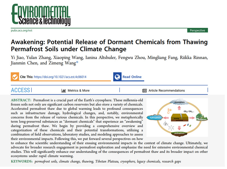 近日,在国家自然科学基金面上项目、第二次青藏高原综合科学考察研究项目(STEP)等资助下,日韩无码 环境系王梓萌教授联合丹麦哥本哈根大学、瑞士洛桑联邦理工学院,和中国科学院西北生态环境资源研究院、青藏高原研究所等单位的多位长期从事冰冻圈生态环境研究的学者,以《Awakening: Potential Release of Dormant Chemicals from Thawing Permafrost Soils under Climate Change》为题,在Environmental Science & Technology上发表了展望(perspective)论文。