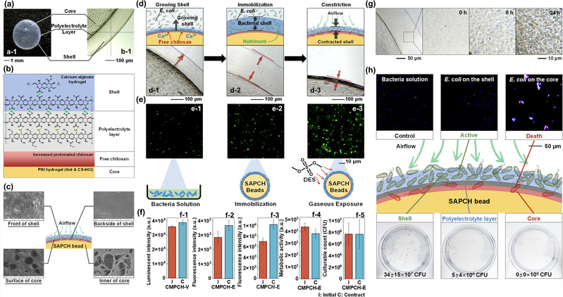 SAPCH微球具有透明的三层核壳结构。核心具有较大的溶胀能力和较低的脱水倾向,而壳层则相反,因此导致壳层在稳定过程中因核心膨胀而首先收缩。化学结构分析表明SAPCH微球从内到外依次为:由明胶和壳聚糖(CHs)组成的交联水凝胶核心;CHs层;CHs与海藻酸钠的聚电解质层;钙海藻酸水凝胶外壳层。细菌通过钠海藻酸与Ca²⁺交联被动固定,并在核心持续释放的营养物质支持下存活和繁殖。空气吹扫后,壳层快速失水并收缩,细菌因此高密度固定于薄薄的水凝胶层,暴露于气液界面。荧光检测程序通过测量固定在壳层中细菌产生的光学信号变化,实现对空气污染物引起的特定基因毒性或氧化应激进行定量化评估。此外,SAPCH微球在合适条件下(37°C70%湿度)可支持细菌存活繁殖24小时,并保持理想的机械强度。