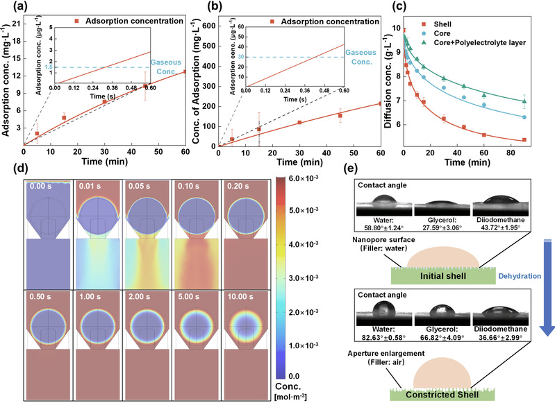 通过对气态甲醛和苯酚的吸附和扩散实验,气态暴露的灵敏度大幅增加主要归结于SAPCH微球对气态VOCs的吸附和累积。不同气态VOCs灵敏度的提升可能归结于其在SAPCH微球上的吸附能力。吸附实验显示,甲醛迅速扩散至微球内部,而苯酚则主要积累在表面,扩散较慢。此外,多物理场耦合瞬态模拟显示,气态污染物在接触微球后迅速附着于壳层表面,并均匀扩散至整个壳层。而聚电解质层的低扩散能力则将污染物限制在了壳层中,进一步增强了SAPCH微球的毒性检测性能。接触角实验表明,壳层收缩后亲水性下降,表面粗糙度增加,物理吸附增强,促进了细菌与气态污染物的充分接触。