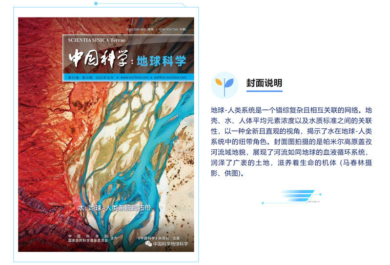 在国家自然科学基金和中国科学院地学部学科发展战略研究项目的资助下,日韩无码 王梓萌教授与项目负责人,中国地质大学(武汉)校长王焰新院士、北京大学鲁安怀教授、长江大学校长刘勇胜教授联名在《中国科学·地球科学》杂志上撰文,展示项目研究成果。文章以“水脉相连”为主题,以直观的“元素相关性”分析为切入点,从新颖的角度解析了水圈和水循环在地球-人类系统的纽带作用。论文以中英双语发表,并被选为2023年10月期的封面。