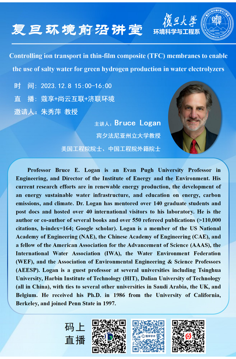 【复旦环境前沿讲堂】Controlling ion transport in thin-film composite (TFC) membranes to enable the use of salty water for green hydrogen production in water electrolyzers
