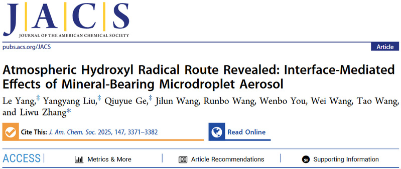 羟基自由基是大气中最重要的氧化剂之一,主导气溶胶成分转化、污染物降解及气候调节。先前的研究表明气溶胶微滴可以自发产·OH。此外,矿物粉尘,尤其是含有特定矿物(如钛、铁)的粉尘,能够通过光化学途径促进·OH的生成。然而,以往的这些研究以纯粹的固体或者液滴作为理想的气溶胶形态来研究大气化学过程,忽略了固体-液滴这一混合媒介状态在实际大气的可能扮演的重要作用,其涉及的反应机制或许超越了当前对气-固或气-液界面介导的快速界面反应的认知。